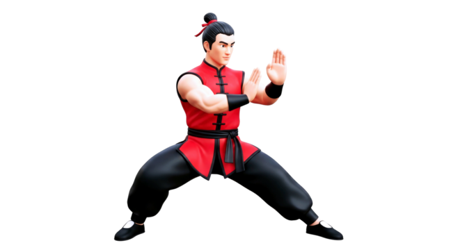 3d cartoon kung fu master focused energy, powerful pose, martial arts skill, isolated on transparent background