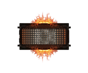 Fiery Demise A Burntout Power Cell Module Engulfed in Flames Isolated on a Seamless Plain White Canvas Depicting Destruction