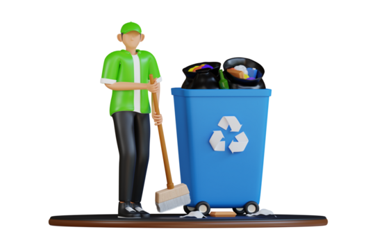 Male worker wearing green shirt and cap sweeping trash with broom next to blue garbage bin full of garbage on transparent background