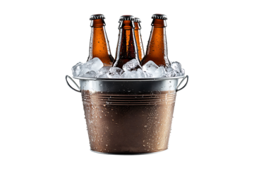 Chilled Beer Bottles in Modern Ice Bucket isolated on transparent background