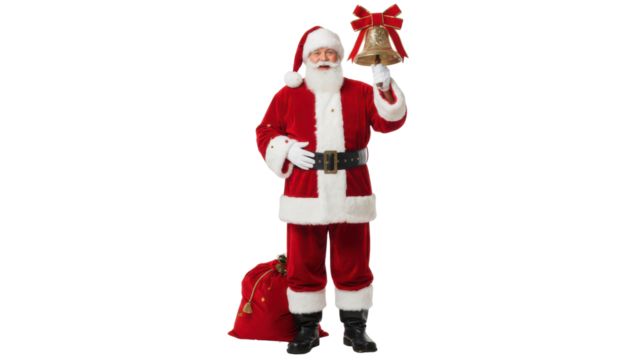 Full Length Traditional Santa Claus ringing a large golden Christmas bell isolated on Transparent Background