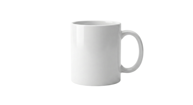 Isolated blank white ceramic coffee mug with a sturdy handle, ready for custom branding or a refreshing drink, presented on a minimalist backdrop, perfect for mockups and personalization