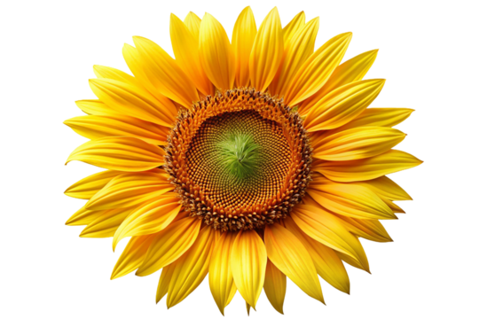A fully bloomed sunflower with bright yellow petals and detailed textures, on a transparent background