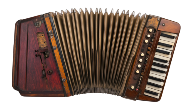 An antique, richly detailed, dark wood accordion with bellows fully extended, isolated on transparent background