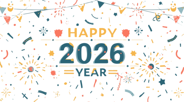 illustration of a happy new year decoration featuring a flat design style with bold lines, vibrant colors, and abstract shapes, including confetti, firewor with png Transparent