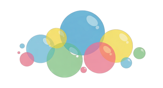 Colorful illustrations on transparent background, fun and playful layout