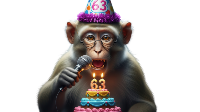 Monkey Wearing Party Hat and Glasses Holding Microphone Singing Happy 63rd Birthday with Cake isolated PNG with Transparent Background