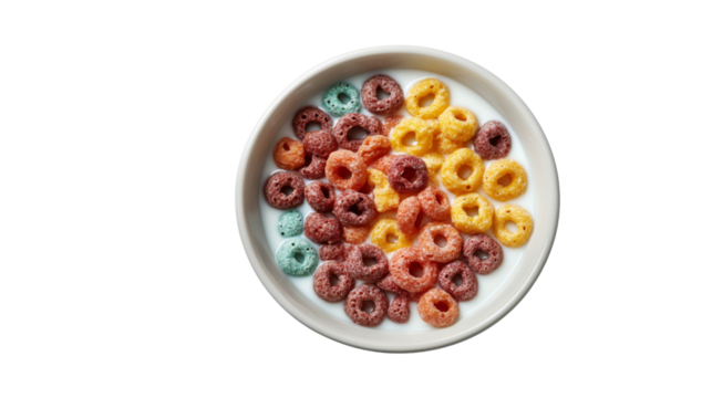 Colorful cereal rings floating in milk in a bowl on transparent background