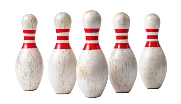 Five vintage, worn, off-white wooden pins with red stripes, standing upright on black background