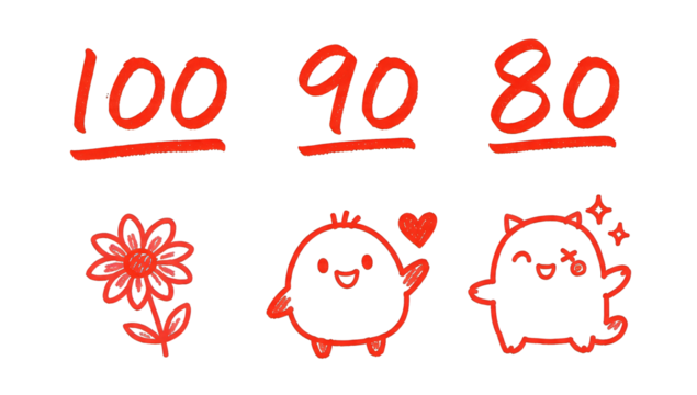 Cute hand drawn red numbers 100, 90, 80 with charming characters and a flower.