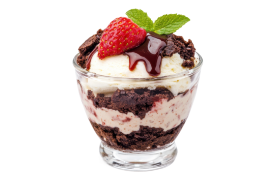 Delicious chocolate strawberry trifle with whipped cream and mint garnish in glass, cut out