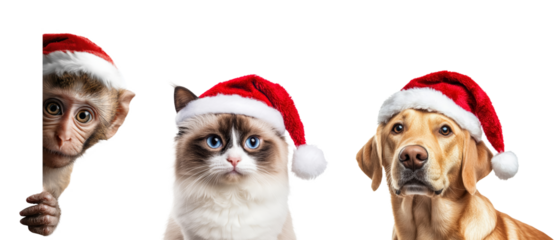 Set of Christmas and New Year animals - monkey, cat and dog wearing red Santa Claus hats, png isolated on transparent background.
