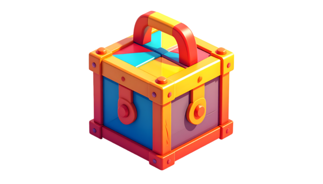 Vibrant 3D Cartoon Treasure Chest Icon - Stylized Mystery Box with Handle for Games, Rewards, Gifts, and Mobile App UI/UX Design on Black Background