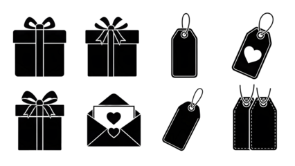 A set of black and white gift icons with ribbons and tags on transparent background for valentines day