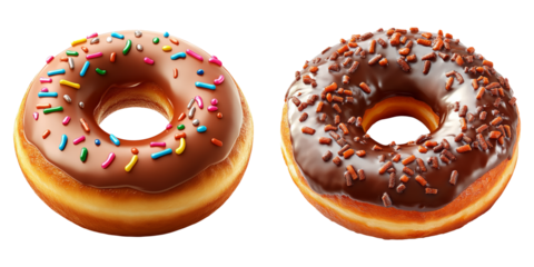 Frosted donuts with chocolate glaze and candy toppings isolated on transparent PNG background perfect for cafe menus and food illustrations