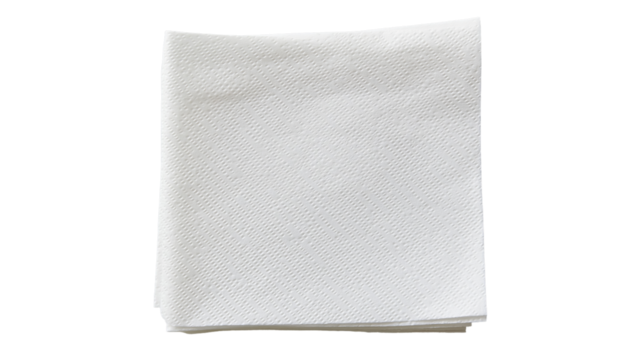 A close-up view of a neatly folded white paper napkin featuring a textured surface, ideal for dining settings and everyday use on transparent background