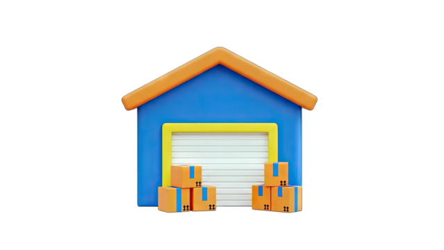 3D Cartoon warehouse with boxes on transparent background