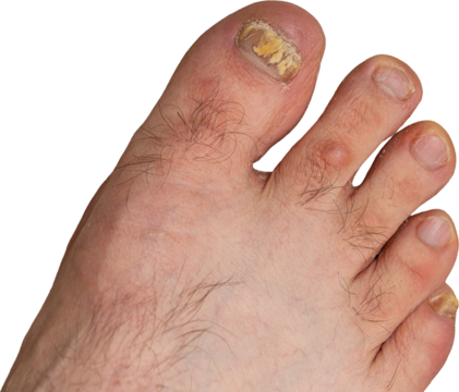 Feet of a man close-up of fingers affected by a fungal nail plate. Ugly toes.