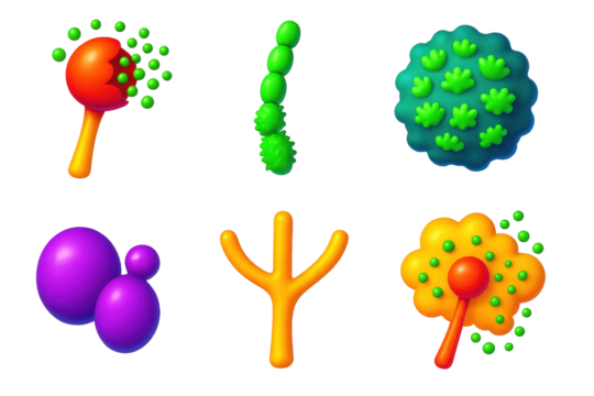 3D Fungal Icon Set. 3D icon set of fungal spores and mold: sporangium burst, conidia chain, fuzzy mold colony, round yeast bud,