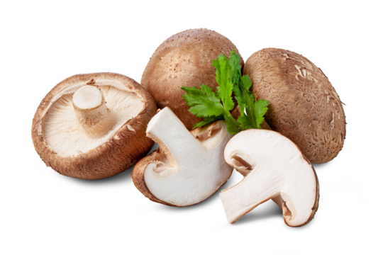 A set of fresh Golden Teacher mushrooms (Psilocybe cubensis) isolated on white.