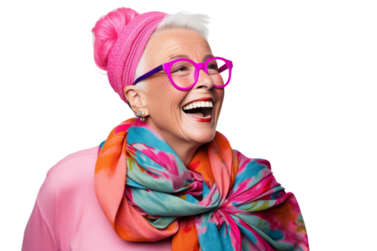 Joyful senior woman wearing glasses and scarf Isolated on white background