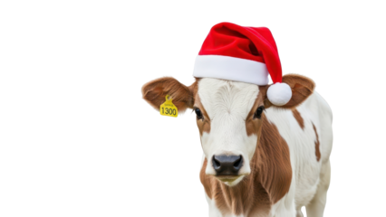 Cute Brown and White Cow Wearing Red Santa Hat for Christmas Holiday isolated PNG with Transparent Background