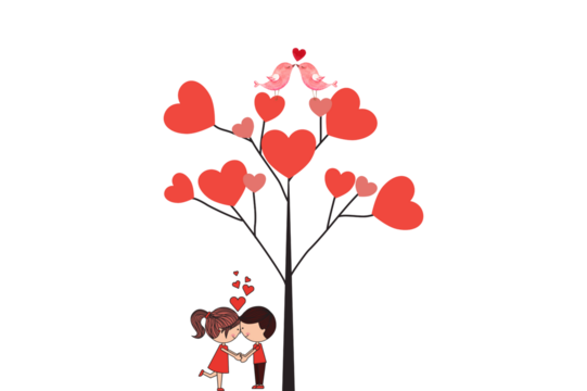 A funny cartoon illustration of a romantic couple of lovers holding a red heart balloon and a rose gift to celebrate Valentine's Day holiday with a wedding symbol and a bear under a love tree