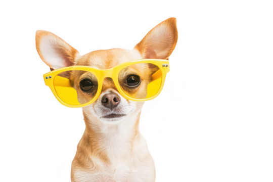 Cute golden retriever wearing red sunglasses and a yellow bandana, facing camera, white background, isolated PNG