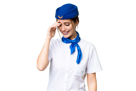 Airplane stewardess over isolated chroma key background laughing