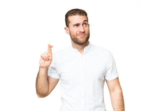 Young Argentinian woman over isolated background with fingers crossing and wishing the best