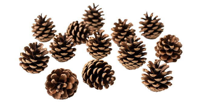 A minimalist arrangement of ten rustic pinecones scattered across a pristine white background. Their rich, earthy brown tones and intricate, textured scales create a simple yet elegant display, perfec