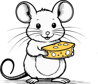 A cute white mouse is holding a large piece of yellow cheese in its paws, drawn in a playful cartoon style.