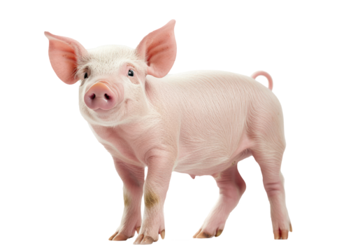 A pig is standing in front of a white background. The pig is pink and has a curious expression on its face