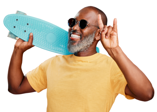 A mature african american man standing with a mini skateboard. Handsome and carefree mature man wearing sunglasses and laughing happily. Summer means rock on isolated on a PNG background.