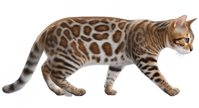 A Bengal cat with a unique spotted coat is shown walking, highlighting its distinctive fur pattern and graceful movement.