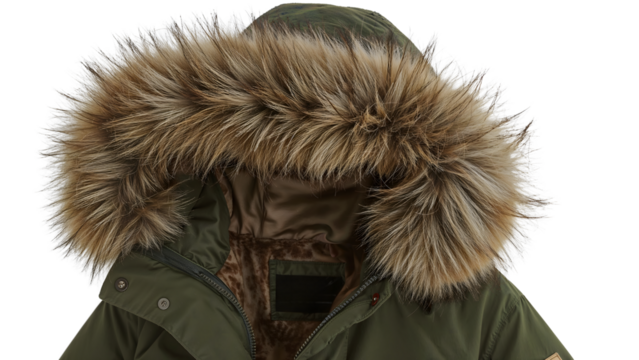 Green winter parka with faux fur trimmed hood on the transparent background, comfortable and warm outerwear for cold weather fashion, detail closeup