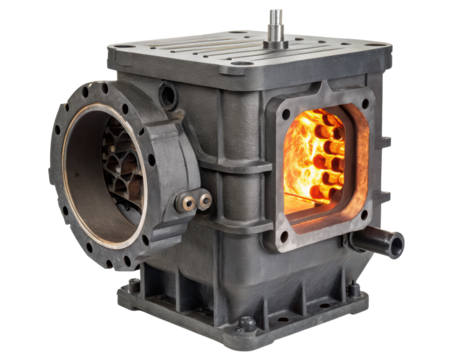 Furnace parts and burner device principle explanation in outline diagram. Labeled educational scheme with detailed technical structure for cool and warm air exchange process vector illustration.