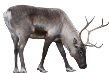 Reindeer grazing on the ground with prominent antlers and a grayish coat in a well-lit environment high-key lighting with cutout object