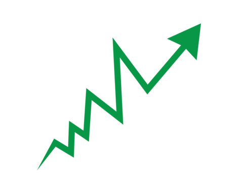 Green sharp zigzag upward arrow for growth, rising trend, increase, business success, analytics, and performance improvement