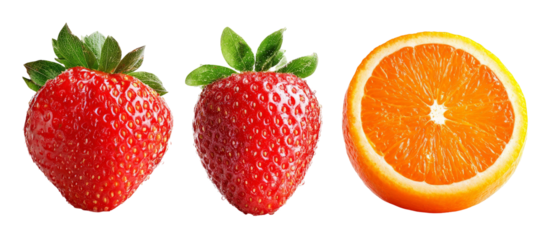 Fresh strawberries and a vibrant orange arranged together, showcasing their natural colors and textures, ideal for promoting healthy eating or fruit-related content