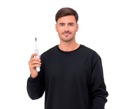 Young man with electric toothbrush promoting oral hygiene and modern dental care on transparent background