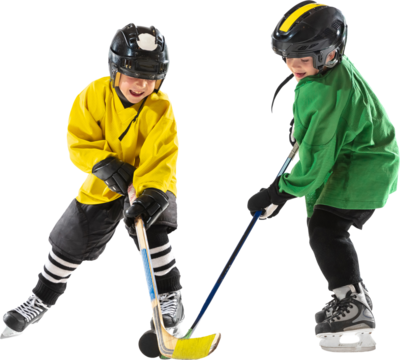 Two young hockey players, children fighting for puck, training, showing skills and focus during game, isolated on transparent background. Concept of sport, childhood, active lifestyle, education