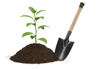 Shiny metal spade with a wooden handle next to a young green sapling ready for planting in a mound of soil. PNG Transparent