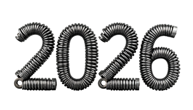 Metallic, spring-like digits form the year 2026 against a black backdrop