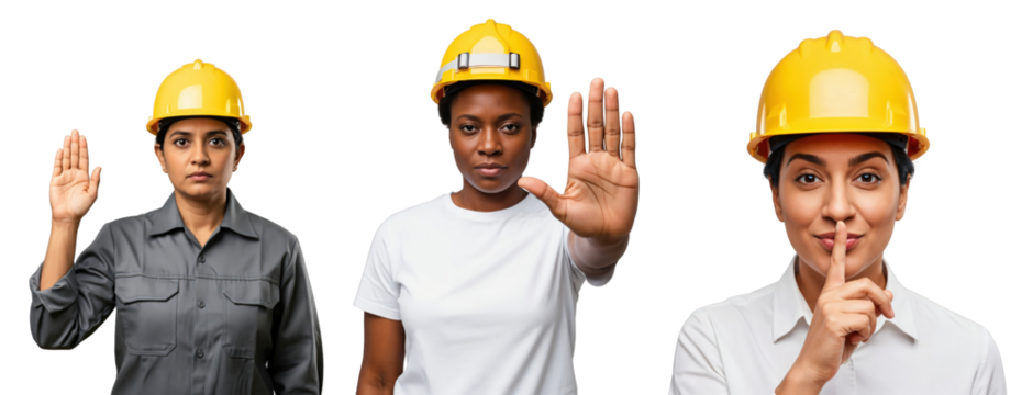 Three diverse young adult women construction workers wearing yellow hard hats making different hand gestures on a transparent background