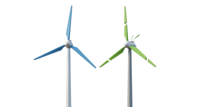 3D Render of Two Modern Wind Turbines with Blue and Green Blades Isolated on White