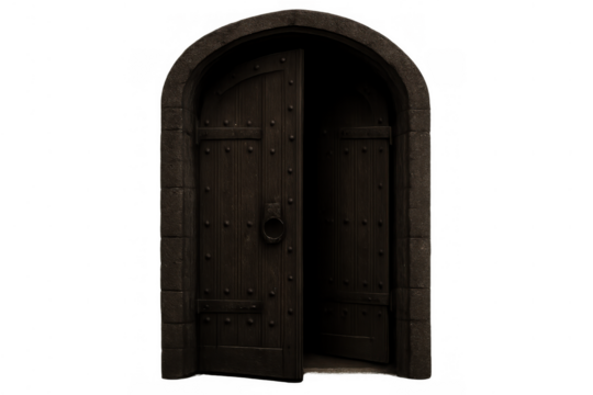 Ancient wooden door opening through a stone archway revealing a dark passage, transparent background for concept of mystery and entrance