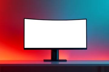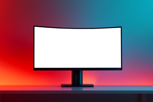 Gaming monitor displaying curved design with vibrant blue-red abstract light pattern, floating on transparent backdrop