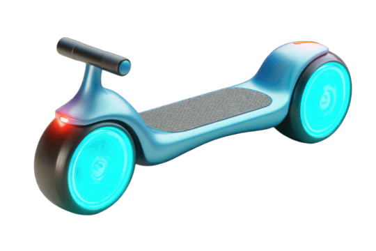 Black hoverboard with blue lights isolated PNG, self-balancing scooter on transparent background for personal transportation and recreation