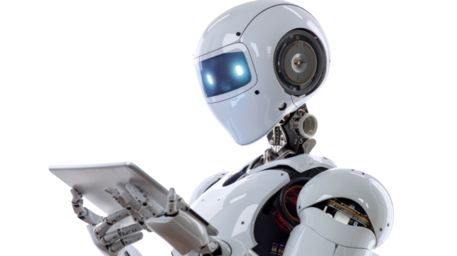 The robot is holding a tablet